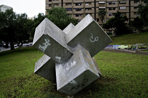• “Macla” del escultor grancanario Eduardo Gregorio, una escultura de hormigón de 2 metros que podemos encontrar en los jardines del Parque de Las Indias, en la capital tinerfeña. La obra consiste en varias cruces unidas.